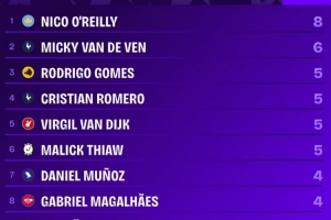 本赛季英超后卫球员进球榜:奥赖利8球居首,范德芬6球次席