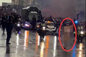据TA记者Guillermo Rai在现场的拍摄,皇马大巴在球迷的簇拥中前往伯纳乌球场,而大巴前还跑过一名裸男。